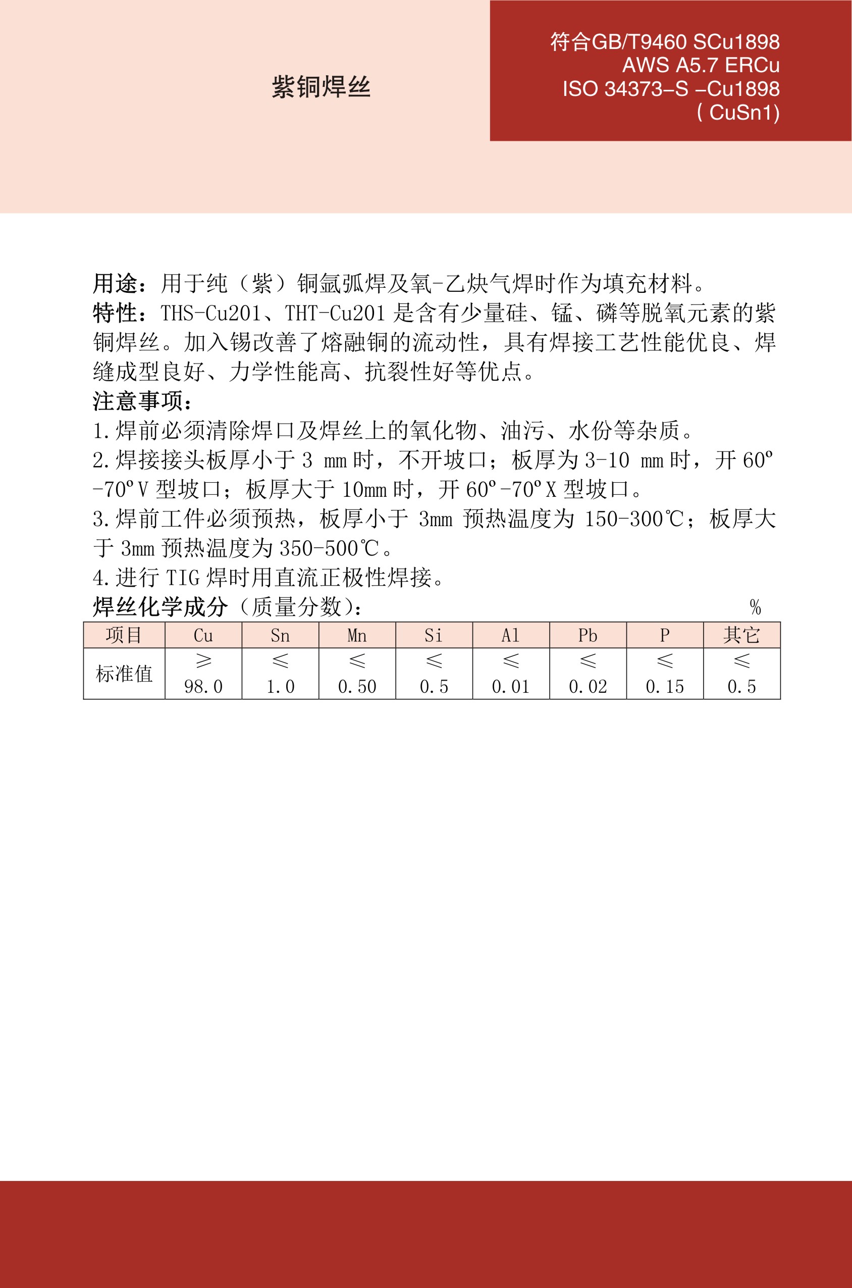 浏览次数:3THT-Cu201紫铜焊丝ERCu铜焊丝 |