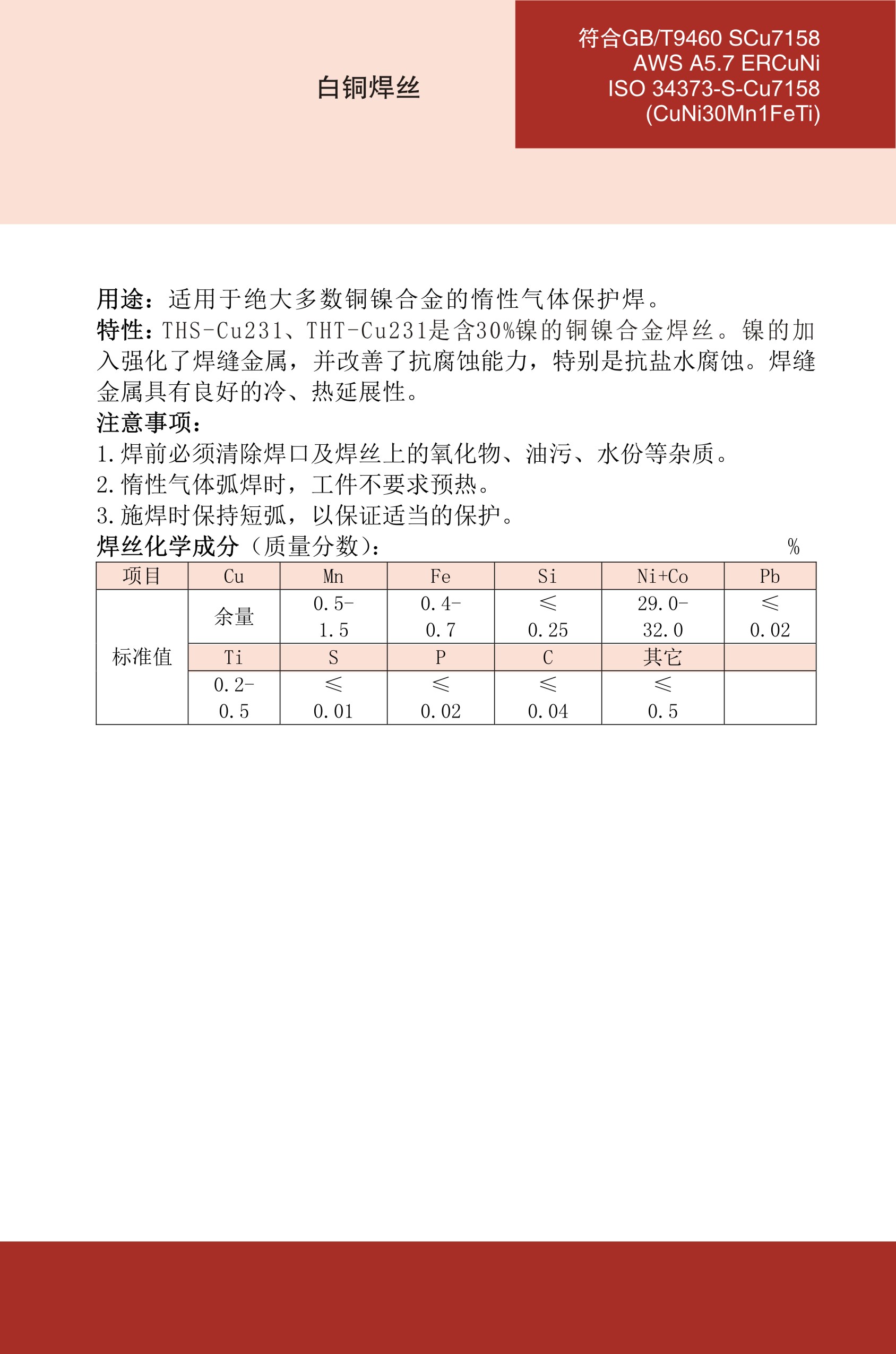 浏览次数:3THT-Cu231白铜焊丝ERCuNi铜焊丝 |