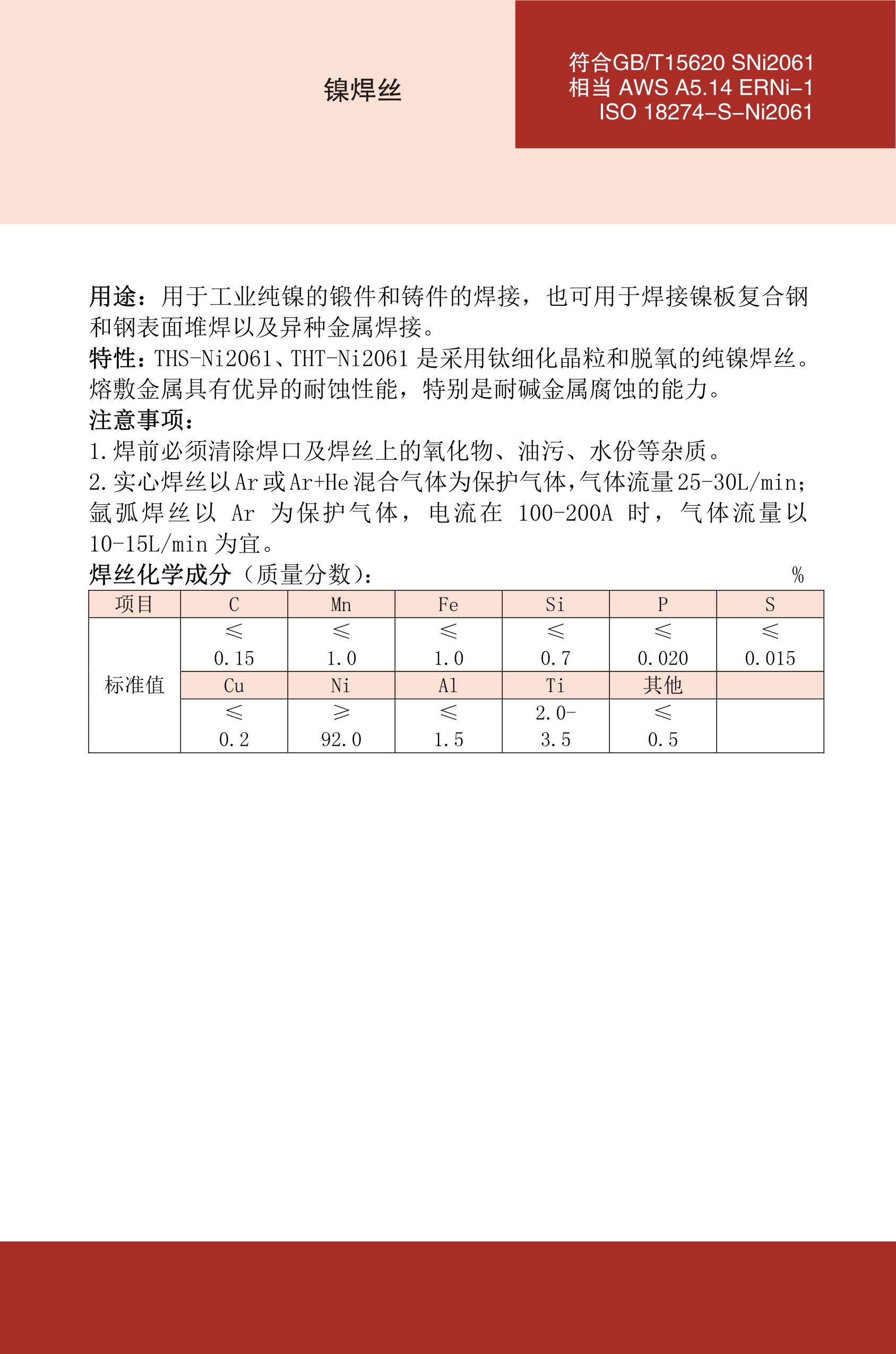 浏览次数:1THS-Ni2061镍基焊丝ERNi-1纯镍焊丝 |